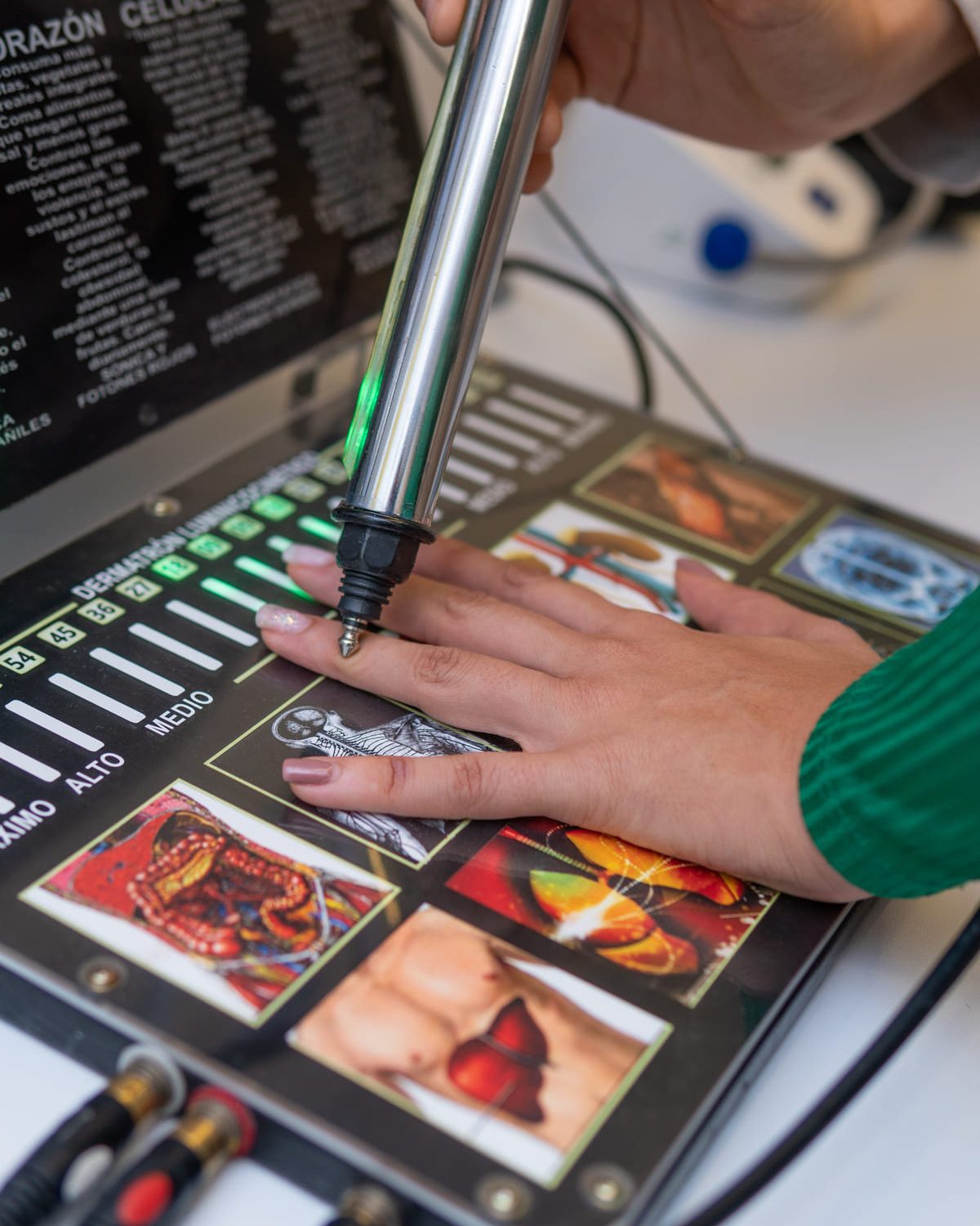 Para complementar nuestro enfoque integral, ofrecemos exámenes con FOTON 12.000, una tecnología innovadora que evalúa la energía bioeléctrica y proporciona una visión profunda de la salud celular y el equilibrio energético. Esta información nos ayuda a personalizar aún más los tratamientos y ofrecer una atención más precisa.